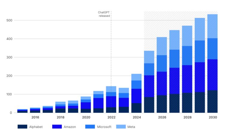 Według szacunków Financial Times1 wydatki kapitałowe na centra danych największych firm tzw. hyperscalerów tj. Alphabet, Amazon, Microsoft oraz Meta wzrosną dwukrotnie między 2024 a 2026. Ten poziom inwestycji nie tylko ma się później utrzymać, ale dalej rosnąć.